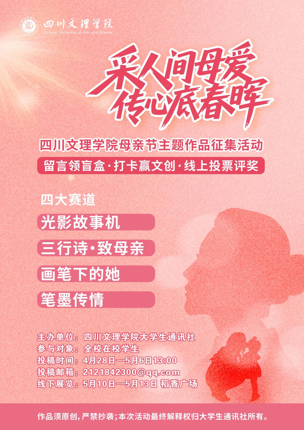 为弘扬中华民族孝敬父母、珍视亲情的传统美德,营造感恩母爱、关爱母亲的良好校园氛围,我校大学生通讯社特举办“采人间母爱,传心底春晖”母亲节主题活动,面向全体在校学生征集各类原创作品,具体事宜通知如下:一、活动主题采人间母爱,传心底春晖二、参赛赛道及作品要求本次活动共设四大参赛赛道,作品需紧扣母爱、感恩母亲核心主题,具体要求如下:(一)光影故事机——摄影作品赛道1. 作品形式:单图或组图均可,组图不超...